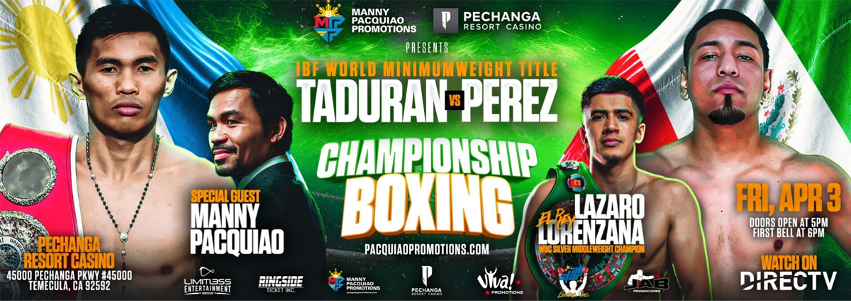 TEMECULA, Calif. — Manny Pacquiao Promotions (MPP) is set to make its highly anticipated return to Pechanga Resort Casino in Temecula, Calif. on Friday, April 3, headlined by a 12-round IBF Minimumweight World Championship fight between reigning champion Pedro “Kid Pedro Heneral” Taduran (19-4-1, 13 KOs) and Gustavo “Smiley” Pérez Álvarez (16-1-0, 5 KOs). Also featured on the card, the reigning WBC Silver Middleweight Champion Lázaro “El Rey” Lornzana (19-0, 13 KOs), continuing the promotion’s commitment to delivering world-class professional boxing events in Southern California.