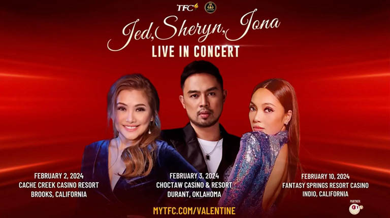 SAN FRANCISCO, JANUARY 19, 2024 – This February, ABS CBN International's Filipino Channel (TFC) and New Paradise Entertainment (NPE) proudly present the much-anticipated Valentine's concert tour, "Jed, Sheryn, Jona Live in Concert," featuring three of the most iconic Filipino talents – Jed Madela, Sheryn Regis, and Jona. The three shows that will feature extraordinary music are all part of the many exciting offerings celebrating TFC's 30th anniversary.