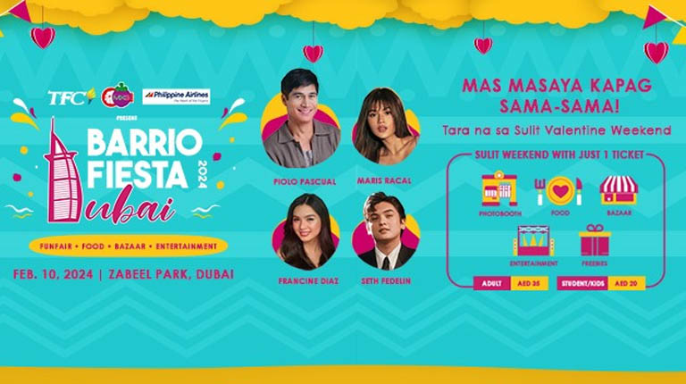 To create a joyful party of love, fun and community, TFC is bringing in the fast-rising love team of Seth Fedelin and Francine Diaz, singer-actress-model-social media influencer Maris Racal, and Filipino Ultimate Heartthrob Piolo Pascual in his first ever Barrio Fiesta sa Dubai. Expect high energy performances, captivating stage presence and fan interaction from these popular Filipino headliners.